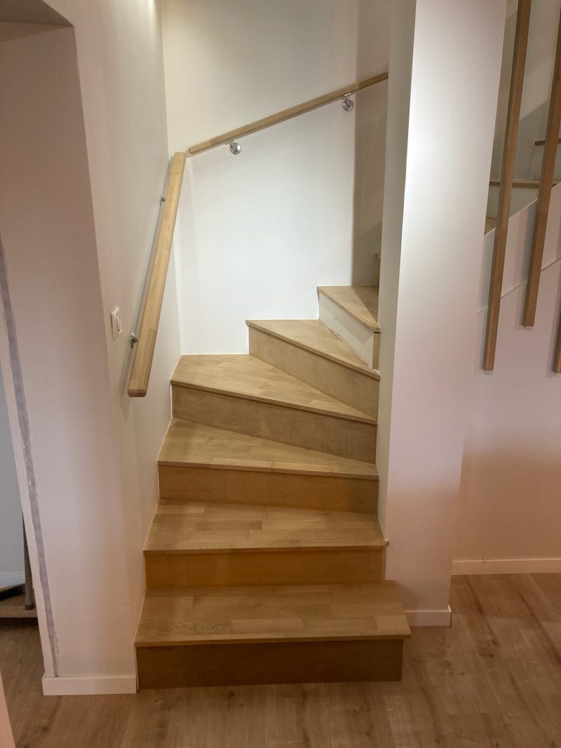 Claustra-rambarde Rénovation pour cet escalier en changeant les marches, elles sont maintenant en chêne massif et la contre marche en médium à peindre. Une rambarde a été installée ainsi qu'un claustra en chêne massif pour combler le vide.