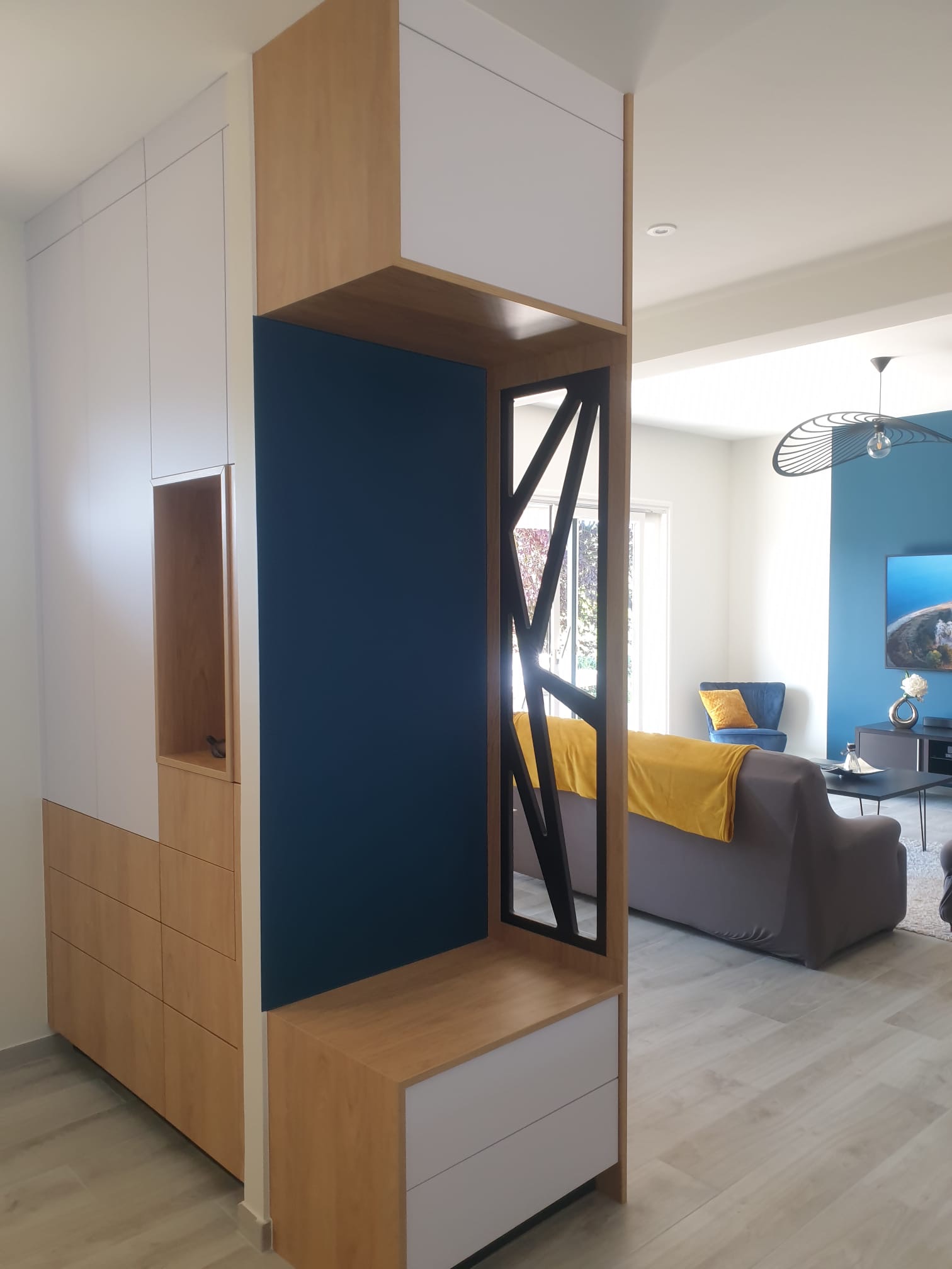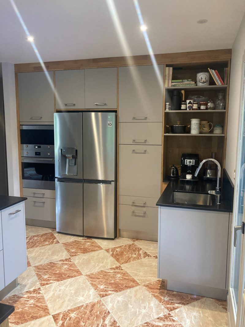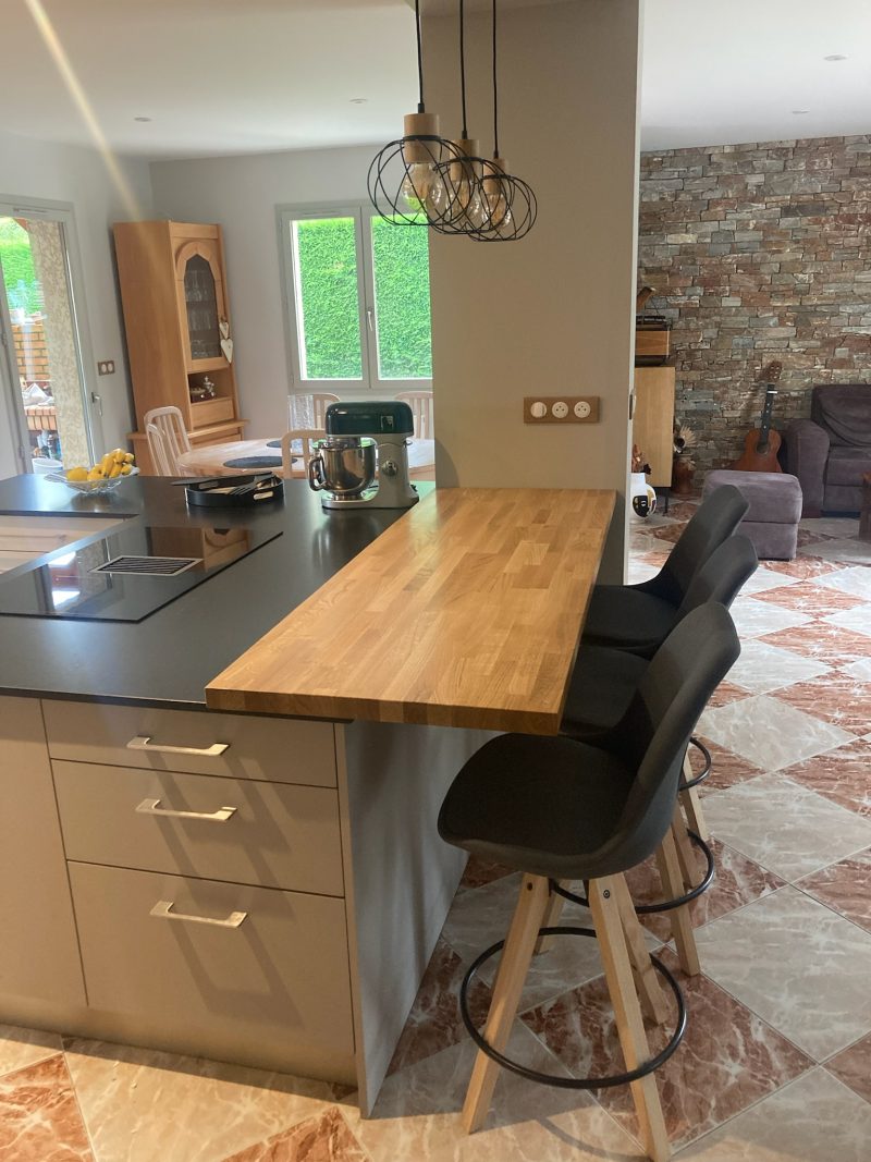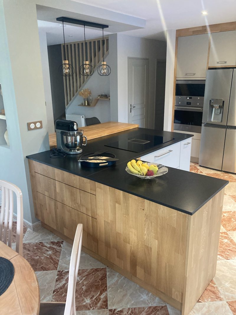 Cuisine bois Rénovation pour cette cuisine alliant le bois lamellé collé chêne vernis et le fenix avec le plan en céramique et l'ilot en bois.