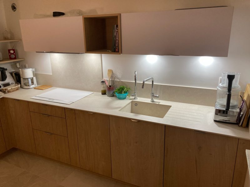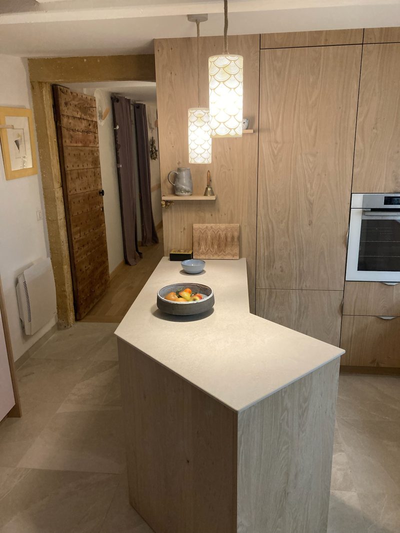 Cuisine d’angle Le sur-mesure c'est optimiser les espaces comme ici. Doux mélange de bois Finsa chêne nature, blanc bianco Fenix et plan en céramique. Plans, conception et réalisation.