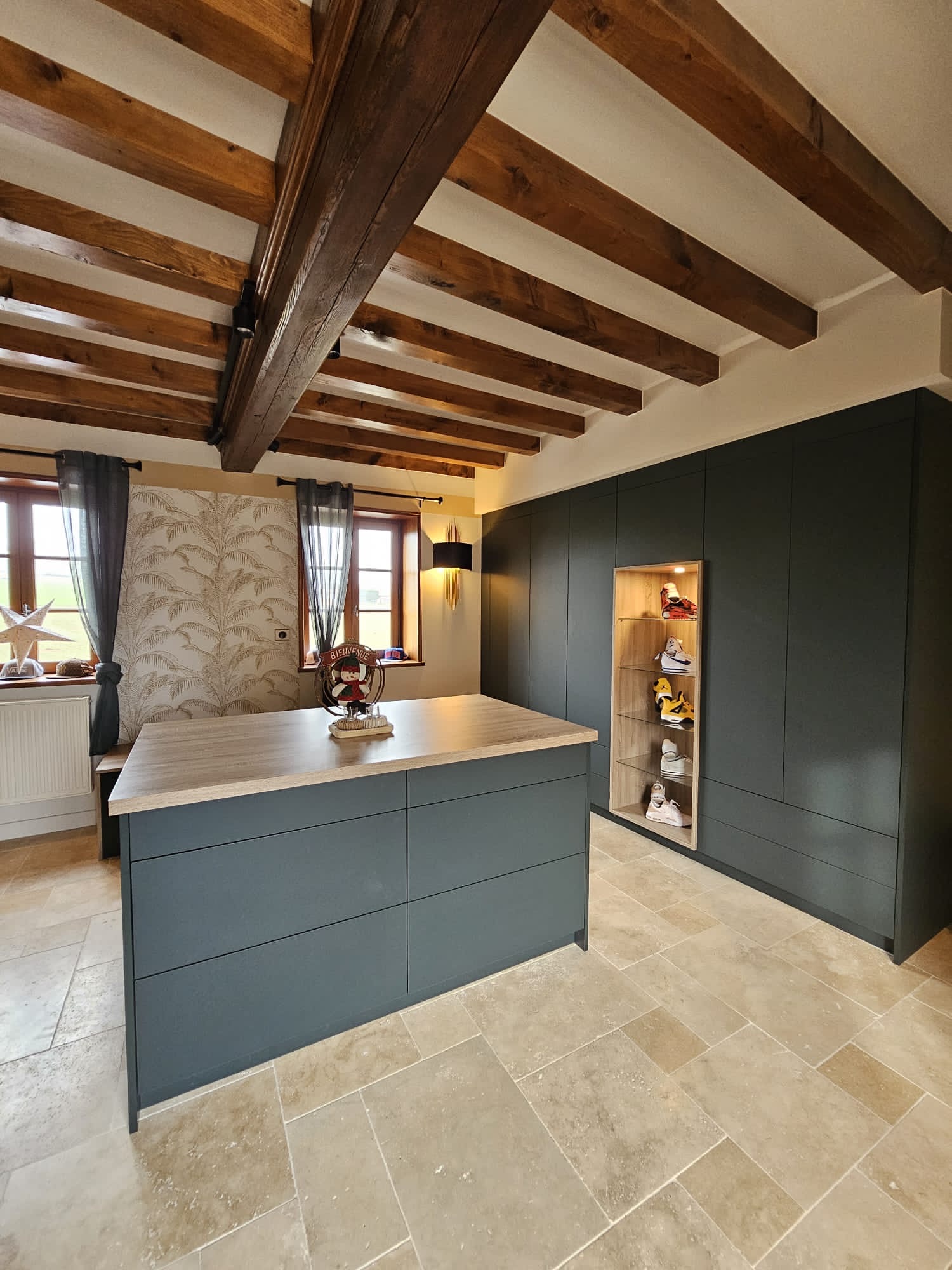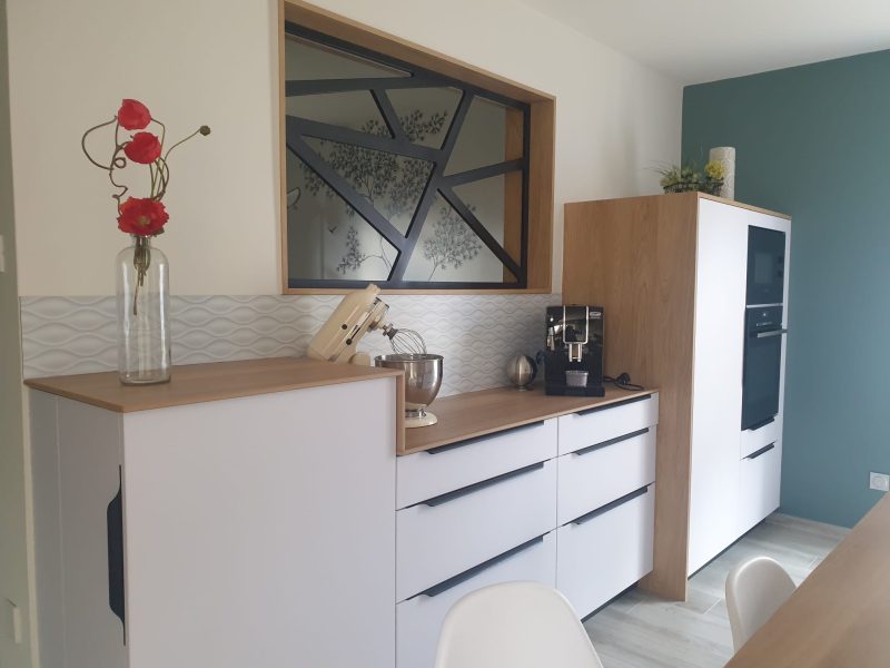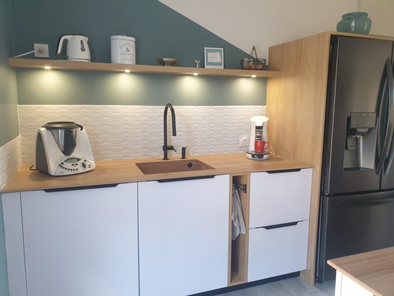 Rénovation cuisine Rénovation complète pour cette cuisine en délimitant des espaces. Façades en blanc alpin, plan de travail en céramique Xtone ewood camel avec évier intégré.
